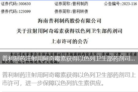 米兰体育APP网站/手机版下载/官网登录入口 (以下简称“普利制药”或“公司”)于近日收到了以色列卫生部药剂司签发的注射用阿奇霉...