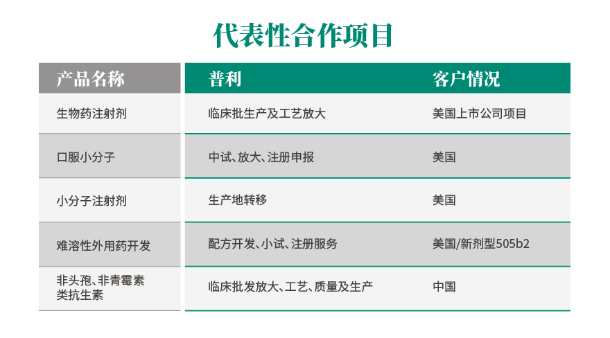 提供综合性闭环服务,支持上市后销售,具有双报优势,国内、国际均可注册,原料制剂一体化,研发及商业化产品不受原料药限制。剂型种类丰富,包括注射剂、缓控释制剂、口服制剂、儿童制剂、外用制剂。品种覆盖了消化道和代谢药物、造影剂、神经系统药物、全身用抗感染药物、肌肉-骨骼系统药物、心血管药物、呼吸系统药物、抗肿瘤药物、眼科药物、皮肤用药等十余个领域。
